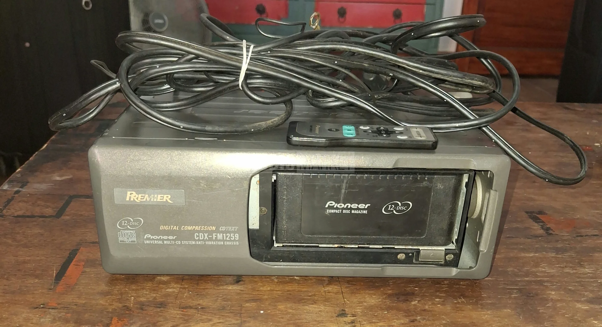 En venta reproductor de CDs múltiple Pioneer Premier modelo CDX-FM1259. Es un equipo clásico de alta fidelidad para autos, ideal para restauraciones de vehículos de los años 90 o principios de los 2000.