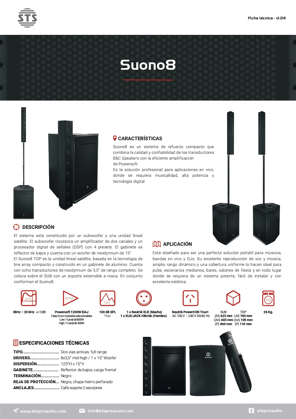 Combina la calidad y confiabilidad. Suono8 es un sistema de refuerzo compacto que combina la calidad y confiabilidad de los transductores B&C Speakers con la eficiente amplificación de Powersoft. Es la solución profesional para aplicaciones en vivo, donde se requiera musicalidad, alta potencia y tecnología digital.